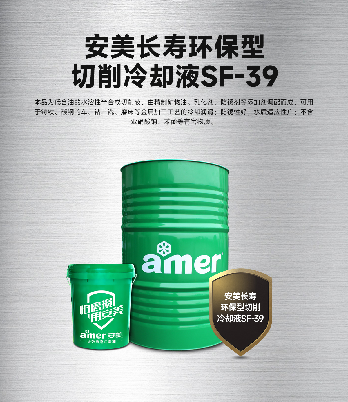 安美長壽環(huán)保型切削冷卻液SF-39是低含油的水溶性半合成切削液,由精制礦物油、乳化劑、防銹劑等添加劑調(diào)配而成,可用于鑄鐵、碳鋼的車、鉆、銑、磨床等金屬加工工藝的冷卻潤滑;防銹性好,水質適應性廣;不含亞硝酸鈉,苯酚等有害物質。