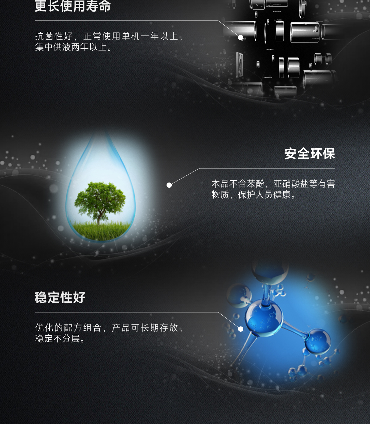 3、更長使用壽命:抗菌性好,正常使用單機一年以上,集中供液兩年以上。