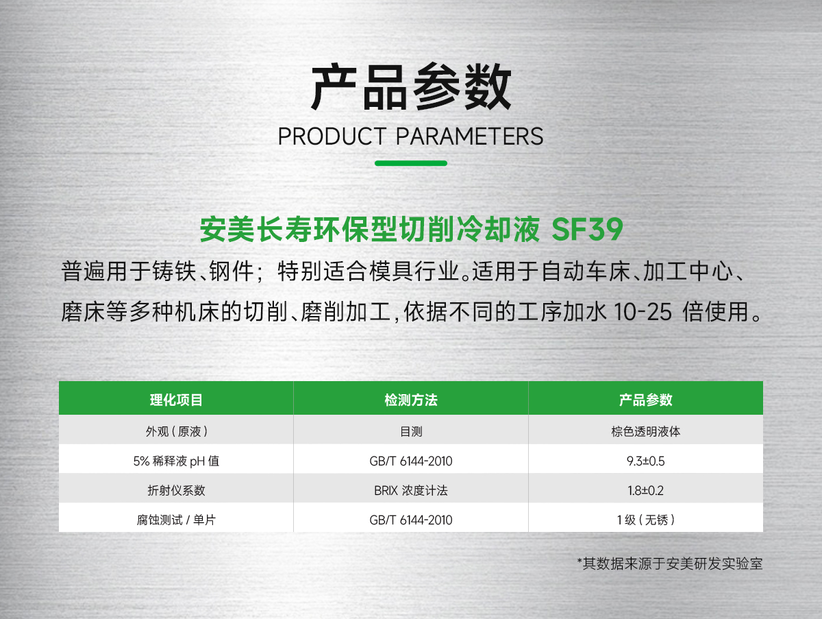 關于安美長壽環(huán)保型切削冷卻液SF-39的其它具體指標參數(shù),請移步”安美商城”下載MSDS和TDS報告瀏覽,或直接切削液生產(chǎn)廠家-安美集團客服熱線400-7788-123/客服微信18576991625查詢索取。